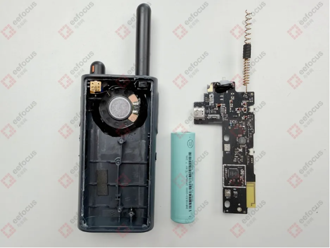 特意提到对讲机的外壳,主要是因为上面还有一个扬声器以及一个用于调频的编码器。至于对讲机的供电电池,规格为INR18650的锂电池,2000mAh,3.6V,7.2Wh。GPHN,这个厂商大家熟悉吗?应该是鹏辉能源的电池,还是一家上市公司。重点来看下对讲机的主板。