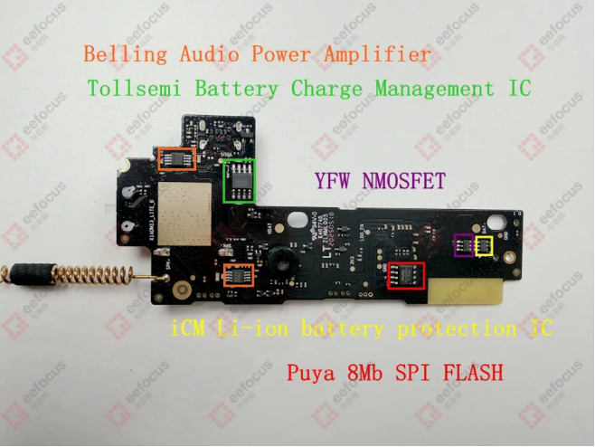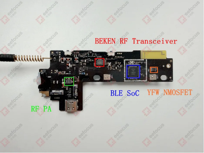 丝印为EP2T16 F40E 的低功耗蓝牙SoC以及丝印为H0604A的射频功放芯片,但并不清楚具体是哪个厂商的什么型号芯片,有知道的小伙伴欢迎留言告知。