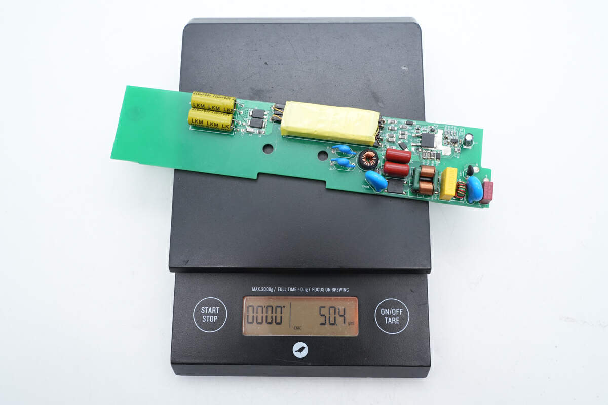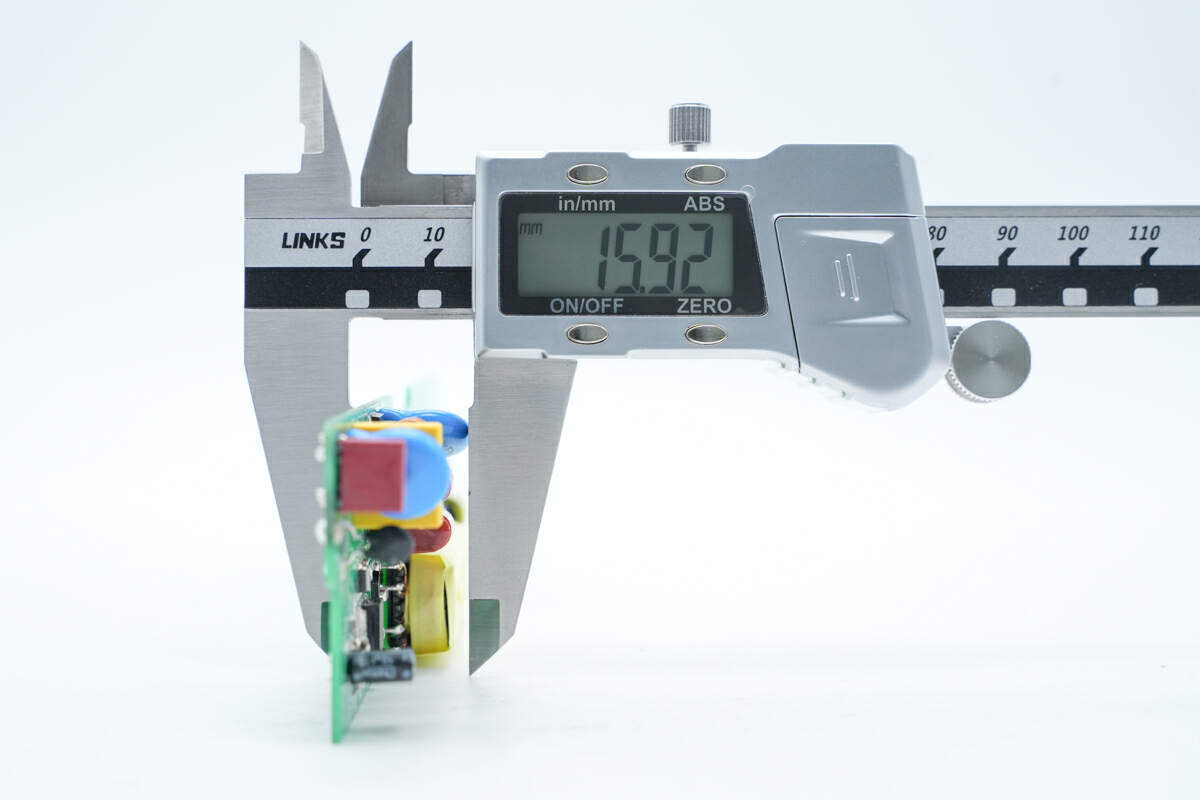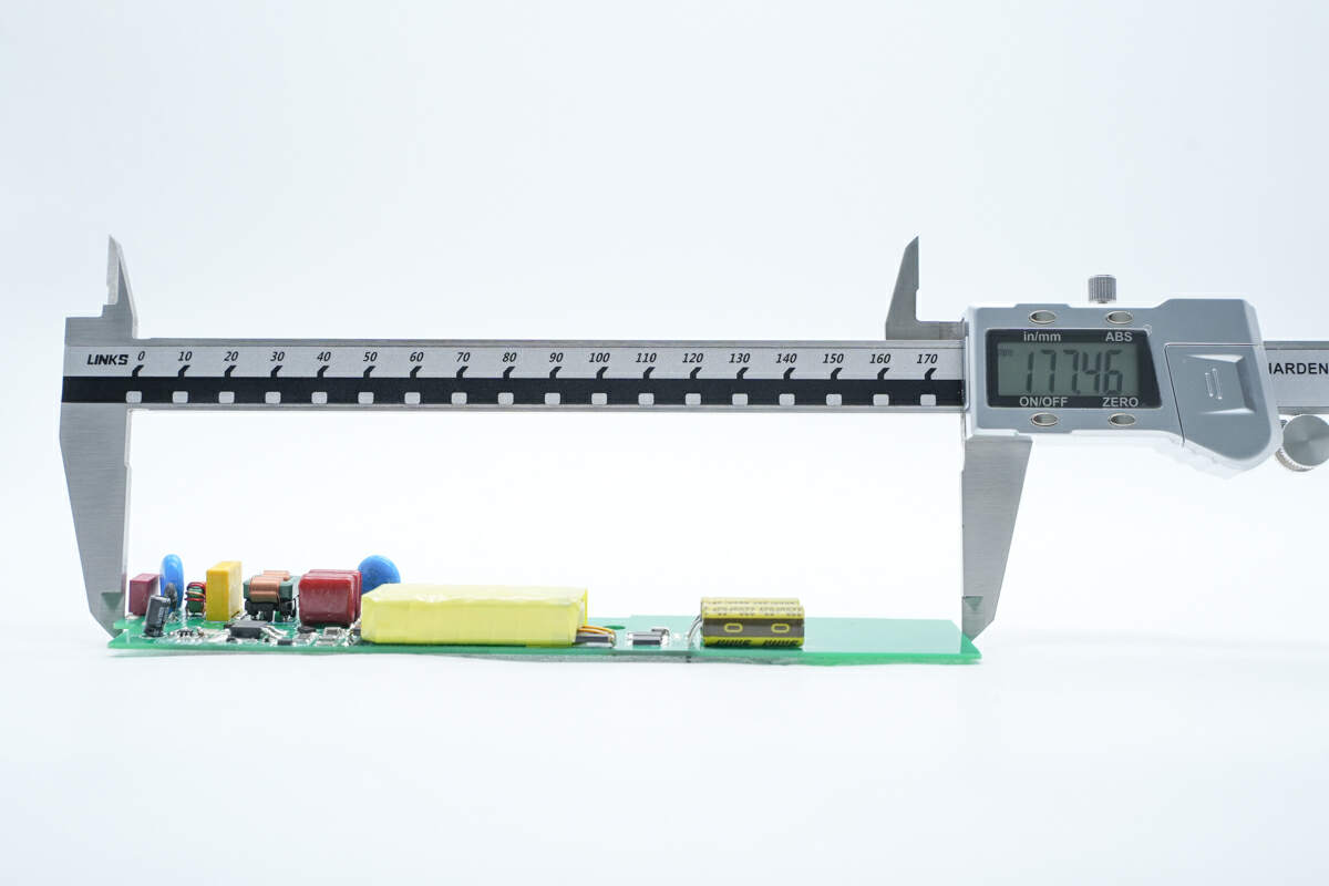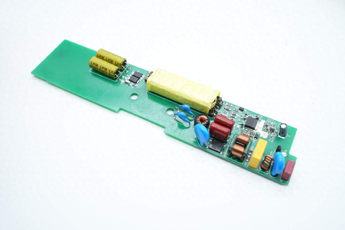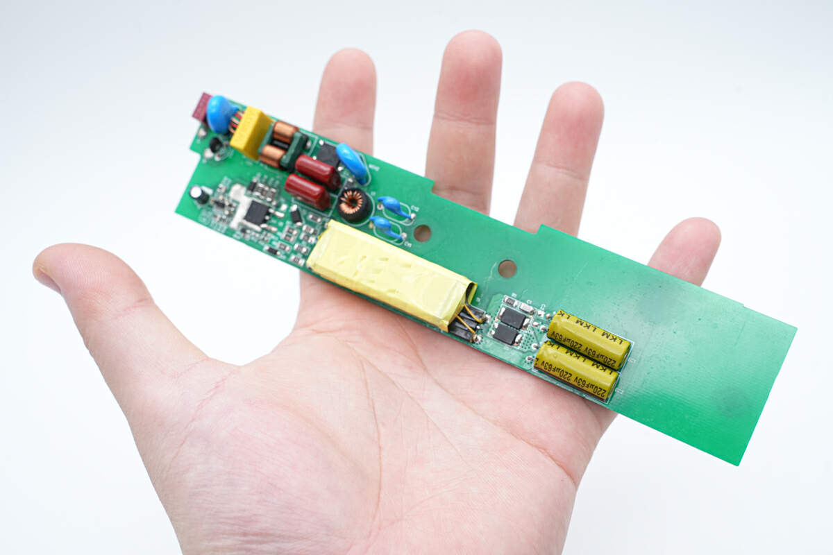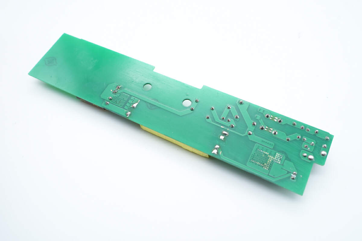 能华45W高PF氮化镓LED驱动电源DEMO采用了扁平化超薄设计,兼容了LED橱柜灯产品的超薄设计要求,氮化镓AC-DC部分非常紧凑,空白的PCB部分可以为后面DC-DC去频闪电路和DALI智能调光电路预留充足的空间,DEMO整体厚度控制得很出色。